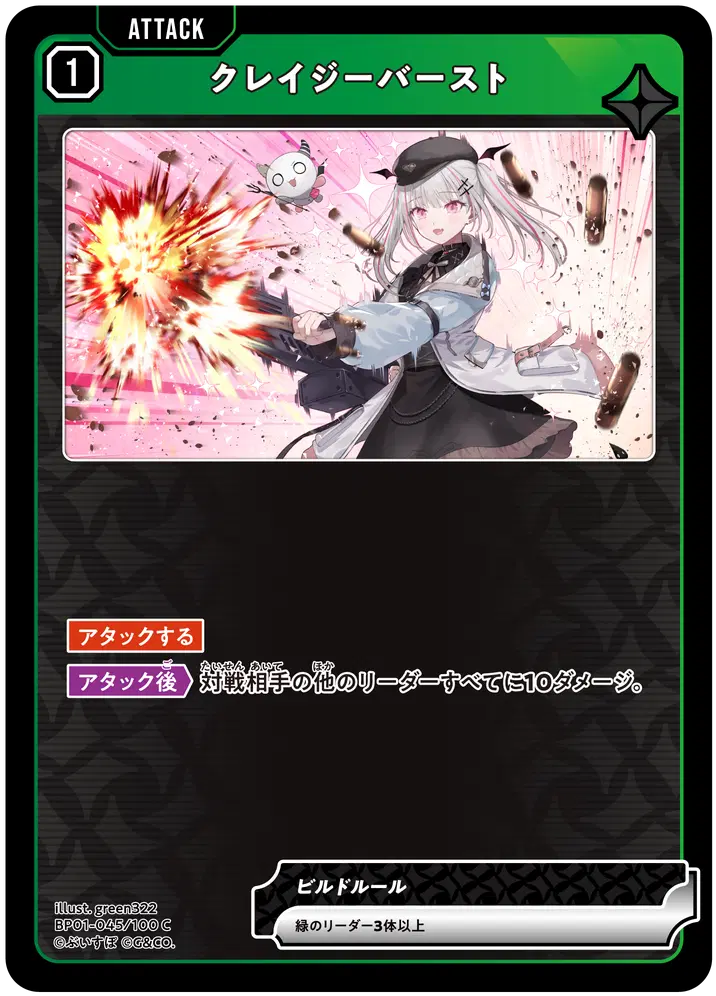 緑リーダーを3体採用することで、専用カード『クレイジーバースト』が使用可能になる点が大きな強みです。ダメージのばら撒きに長けており、複数体へ同時ダメージを与えてリーダーを一気にダウンさせる構成になっています。